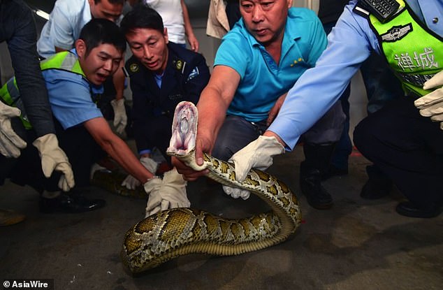 Police in China are pictured holding the python which has allegedly hidden in the ceiling of an entertainment complex for 10 years. The snake crashed through plasterboard last week